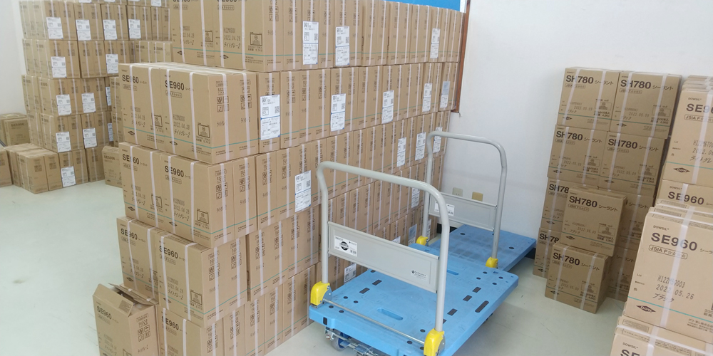 室内の資材置きスペースで商品搬入や、整理などを行います。