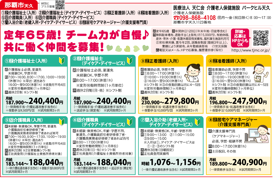 | 電話 | 電話/098-868-4108 [受付]月~金(祝日除く)8:00~17:00 ※ご連絡の際は「しゅふぴたを見て応募しました」と伝えるとスムーズです。 |