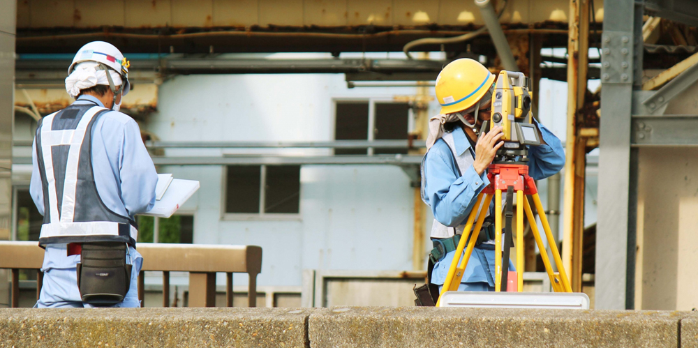 土地の位置や広さ、距離などを専用の機械を使用して測量。