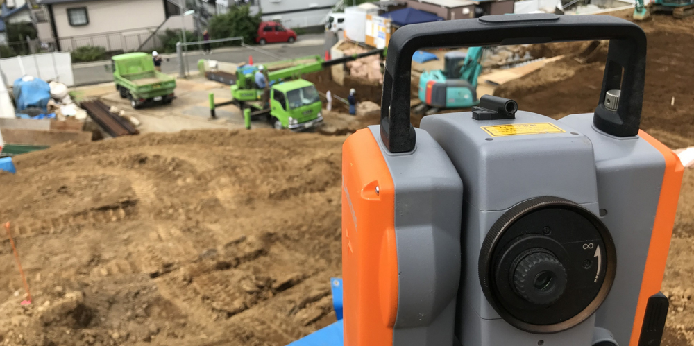 土地の位置や広さ、距離などを専用の機械を使用して測量。