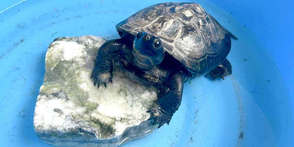| 学童で飼育している「カメキチ」 | 保育園と同じ建物です! |