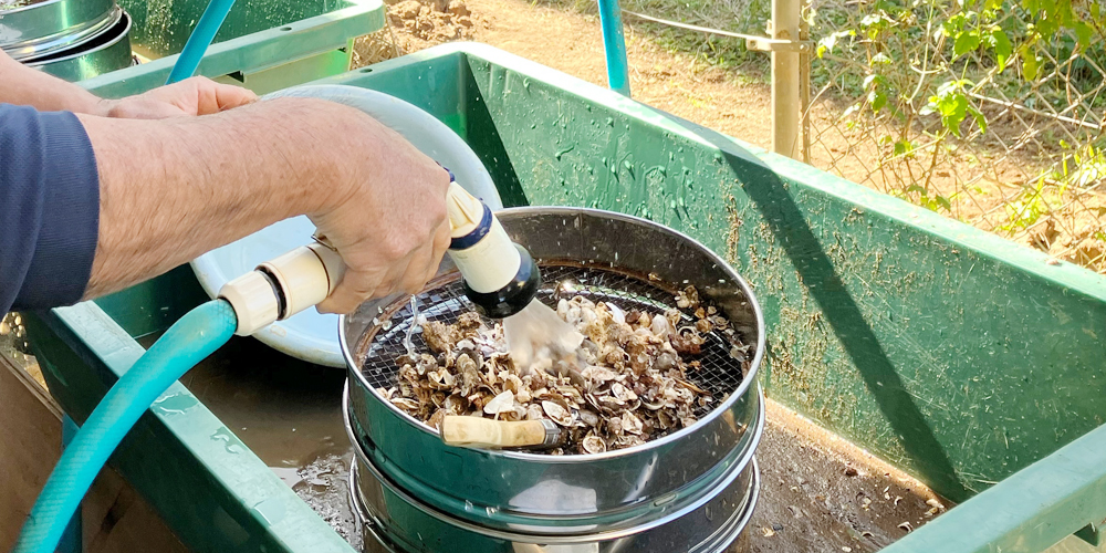 発掘調査現場から持ち帰った土を洗浄し遺物を回収
